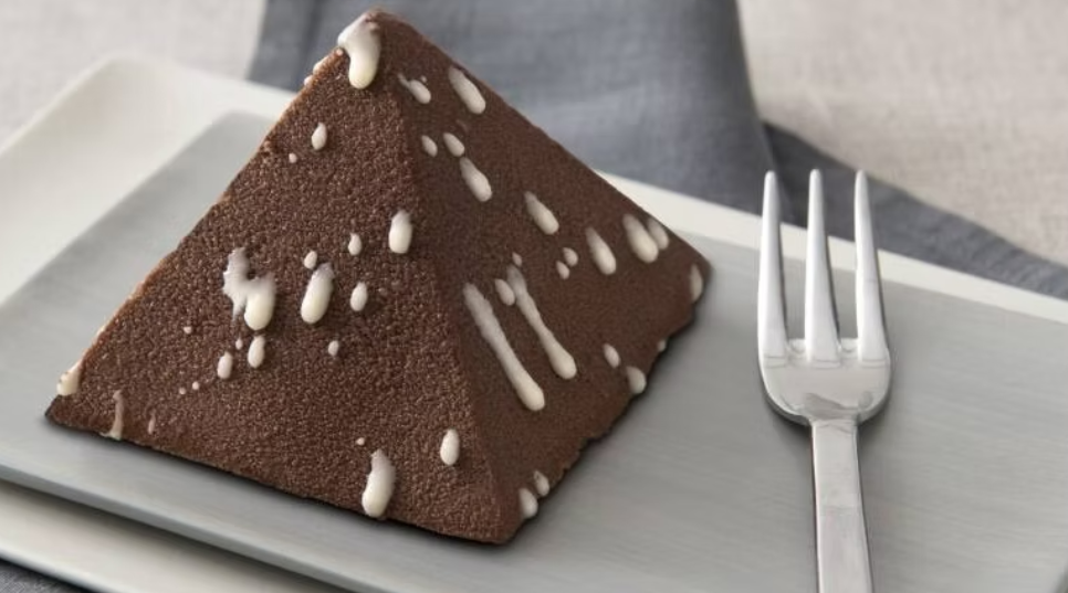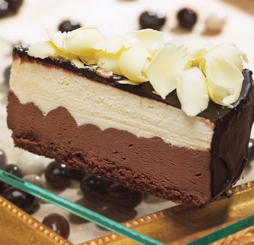 White and dark chocolate mousse on a sponge base, coated with a chocolate hazelnut glaze and topped with white chocolate shavings. 12 cut, 4.1 oz. each.