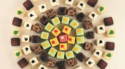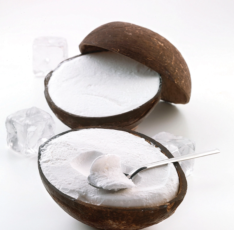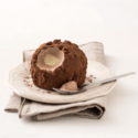 Zabaione cream center, surrounded by chocolate gelato and caramelized hazelnuts, topped with cocoa powder.