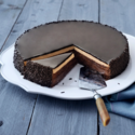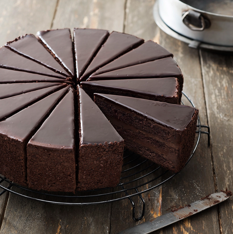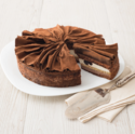 Chocolate layer cake filled with a rich chocolate cream, covered with chocolate ganache and rimmed with chocolate flakes.