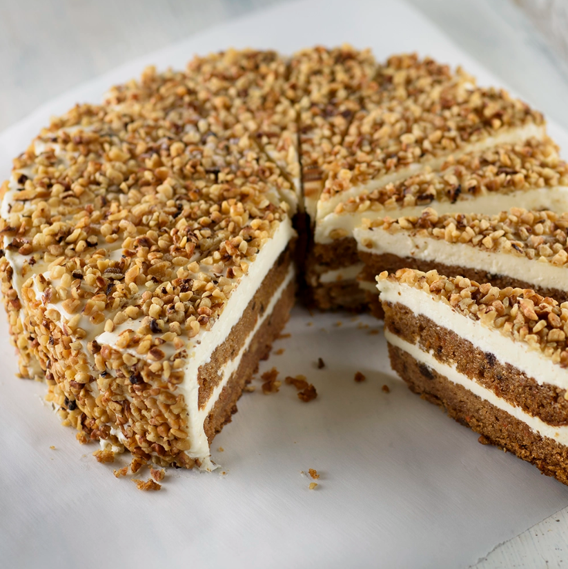 Alternating layers of carrot cake spiced with cinnamon, chopped walnuts and pineapple, covered with a smooth cream cheese topping and sprinkled with crushed walnuts. 16 Cut.