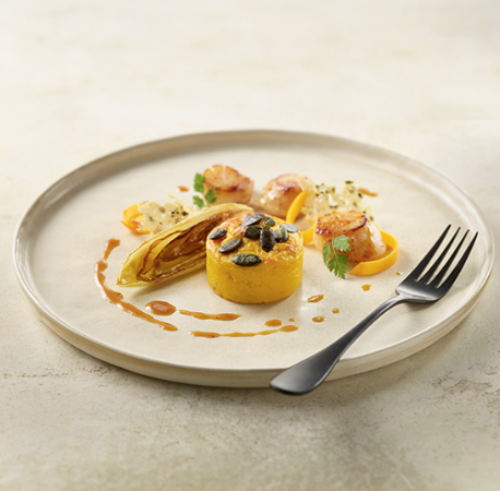 Traiteur de Paris’ Butternut Squash Mousse combines simplicity and refinement. The combination of butternut squash and Grana Padano cheese creates a creamy texture and delicate flavor, all enhanced by a generous topping of pumpkin seeds.