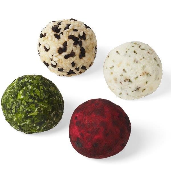 An assortment of goat cheese grape truffles presented in Black & White Sesame Seeds, Beet Red, Parsley Green, and Original White.